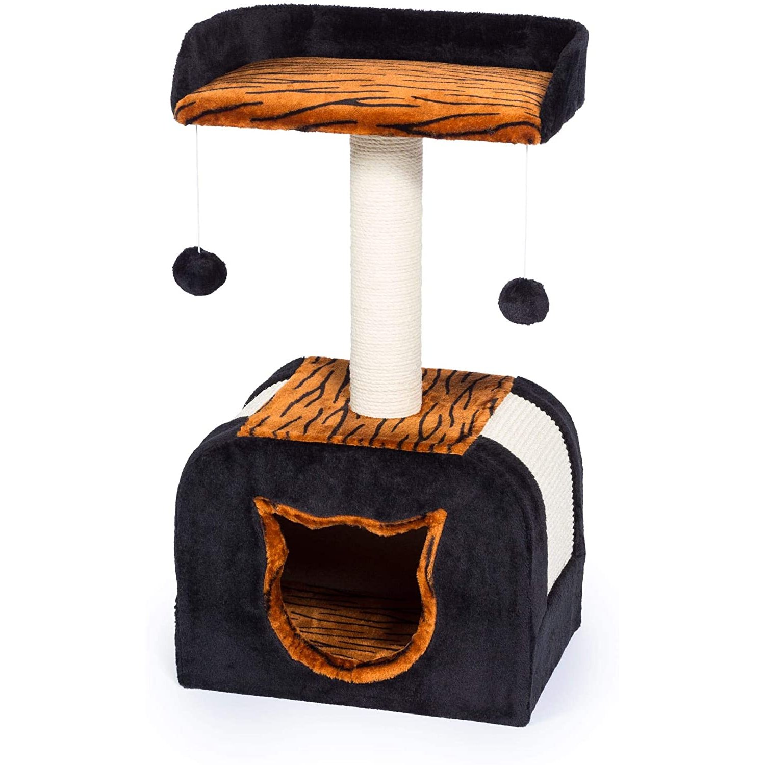 • Two plush, dangling, swat toys hang playfully from the cat bed encouraging kitty to play